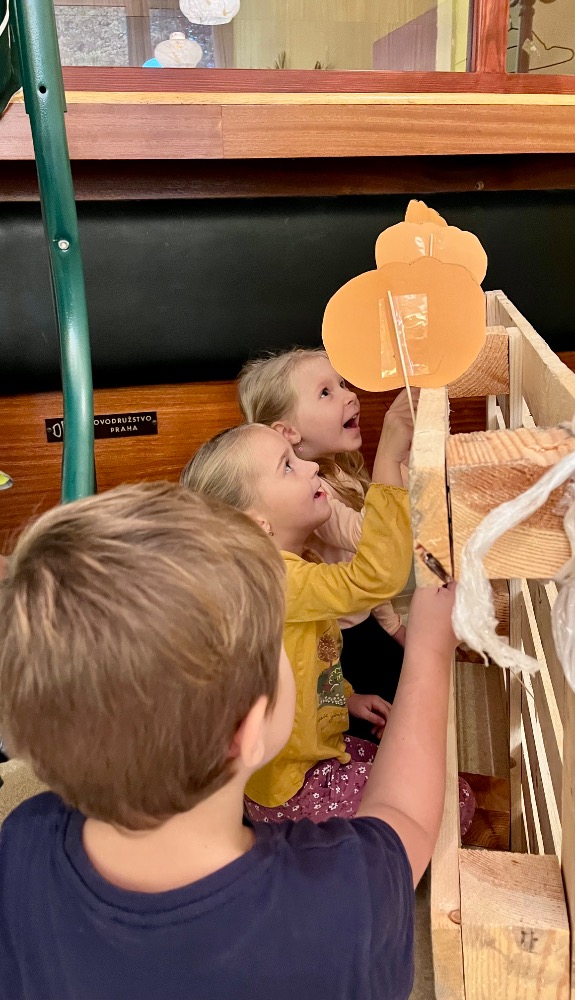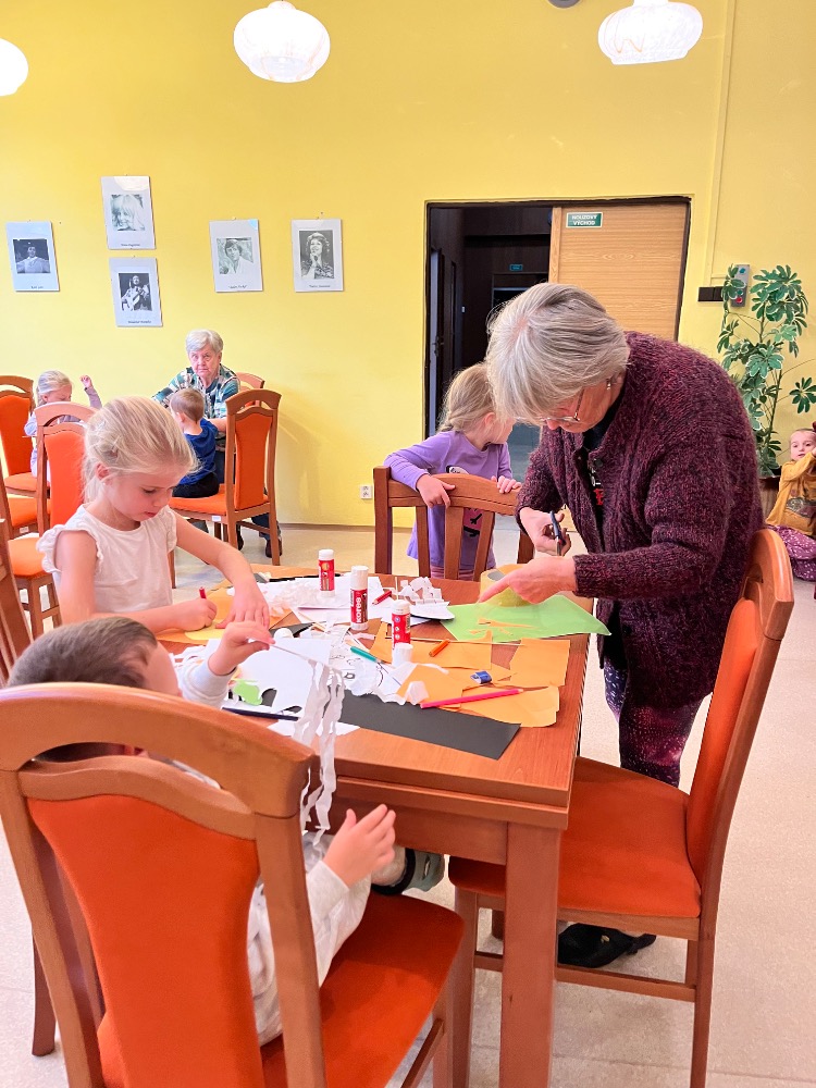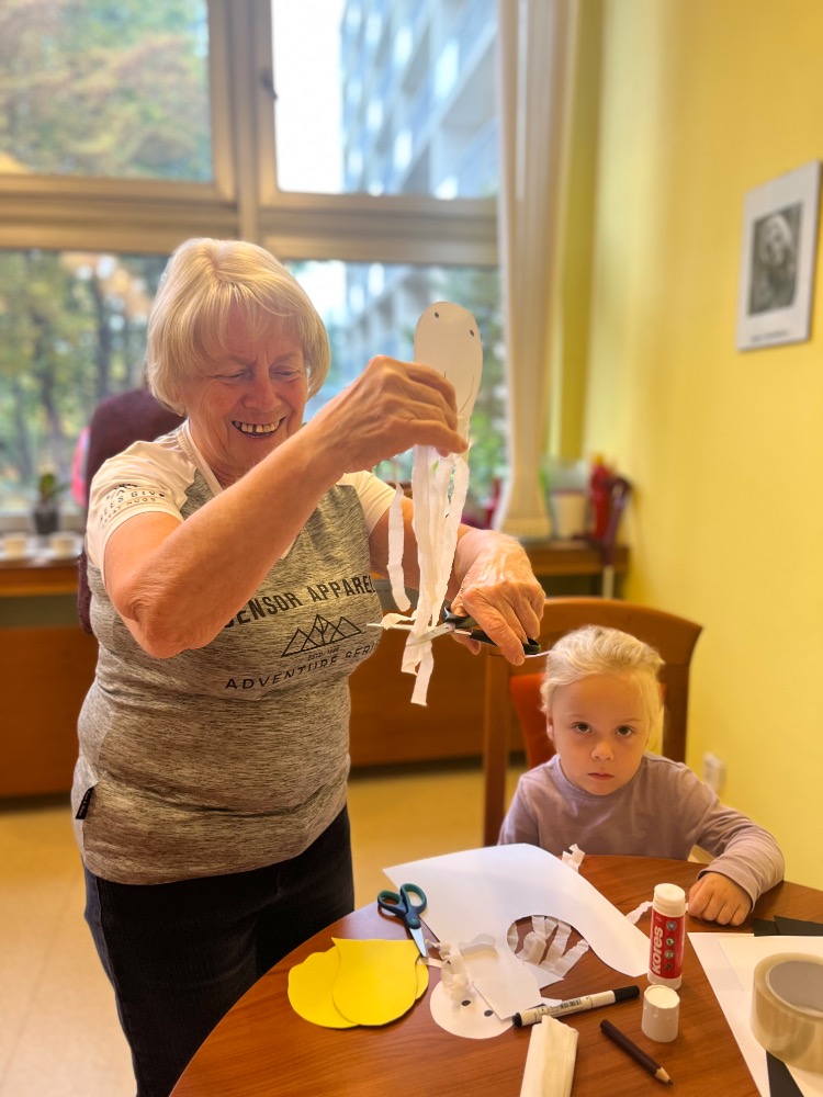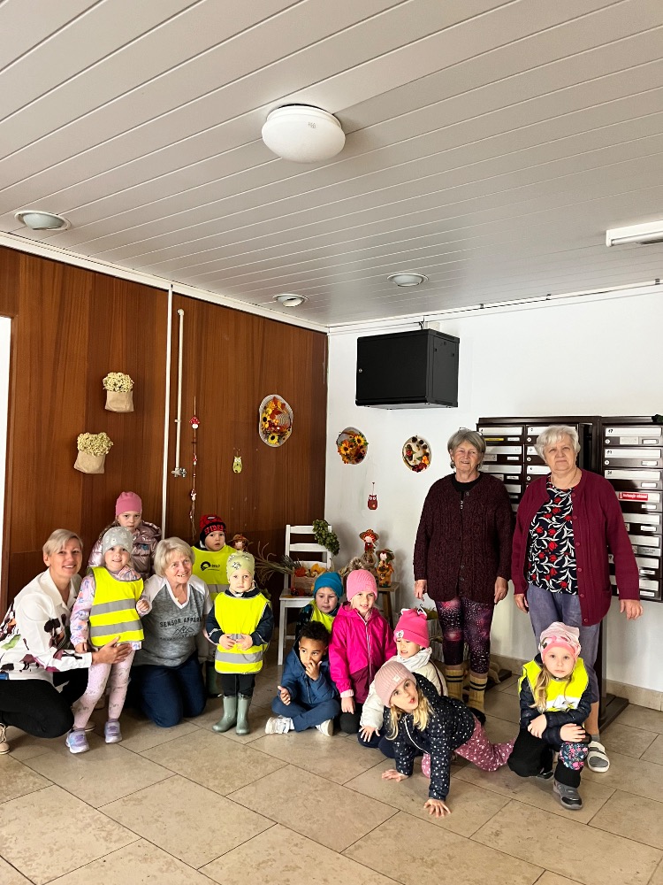 Ve čtvrtek dopoledne se penzionem pro seniory Ke koupališti rozléhal dětský smích a radostná energie. Zavítaly k nám opět malé děti z dětské skupinky U zajíčků, aby se se seniorkami věnovaly společnému podzimnímu tvoření. Některé děti využily své výtvory k tomu, aby nám s nimi bez jakékoliv přípravy zahrály divadlo. Dětská přirozenost a hravost je upřímná a bez přetvářek 🙂💃💃