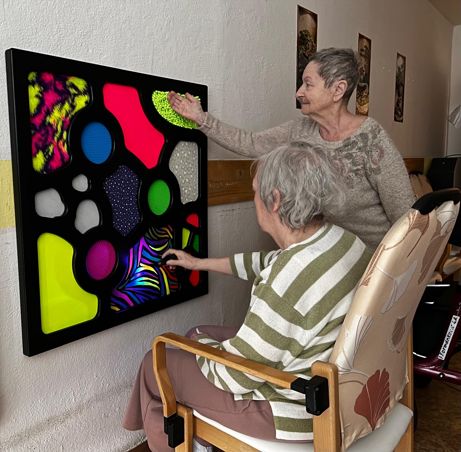 Panely obsahují různé prvky – pohyblivé, strukturované i vizuálně zajímavé. Klienti se jich mohou dotýkat, zkoumat je a zapojovat se do jednoduchých činností, které jsou pro ně přirozené a srozumitelné.