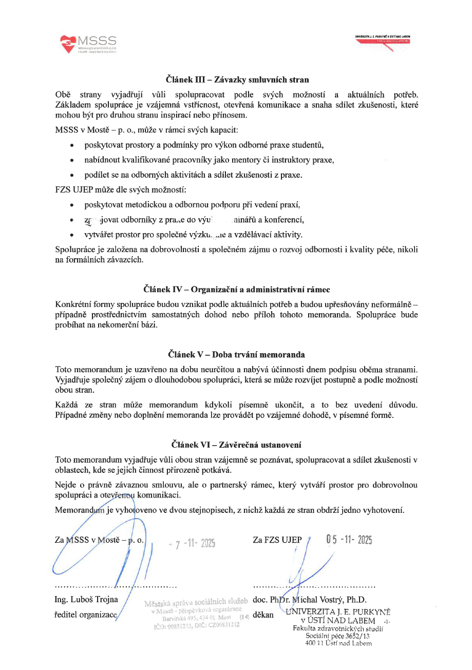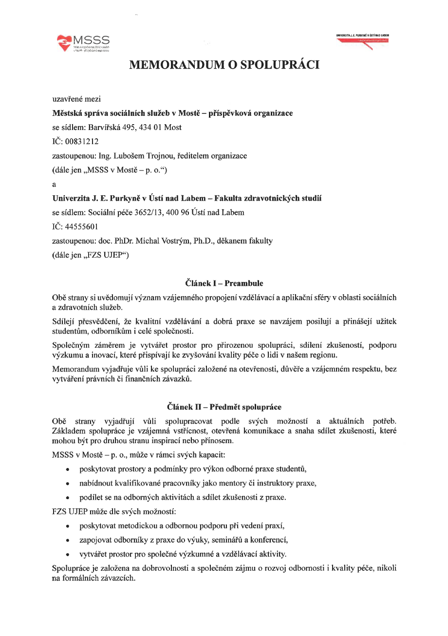 Městská správa sociálních služeb v Mostě – příspěvková organizace (MSSS), a Univerzita J. E. Purkyně v Ústí nad Labem, Fakulta zdravotnických studií (FZS UJEP), dnes stvrdily společný zájem o dlouhodobou spolupráci v oblasti vzdělávání, výzkumu a praxe v sociálních a zdravotnických službách. Memorandum podepsali doc. PhDr. Michal Vostrý, Ph.D., děkan FZS UJEP a Ing. Luboš Trojna, ředitel MSSS v Mostě.