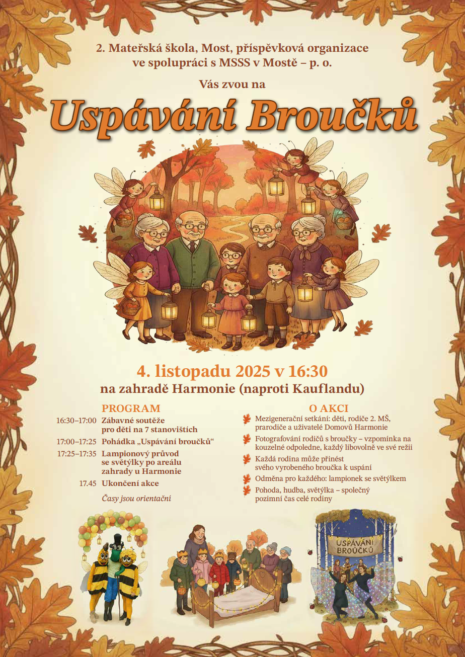 Bylo to mezigenerační setkání plné úsměvů, něhy a hřejivého lidského doteku. Děti nejen z 2. mateřské školy Most soutěžily, poslouchaly pohádku a nakonec se vydaly na lampionový průvod zahradou Harmonie. Každý malý účastník si odnesl lampionek se světýlkem – a my dospělí jsme si odnesli to nejcennější – pocit, že spolu tvoříme svět, kde je dobře být. ❤