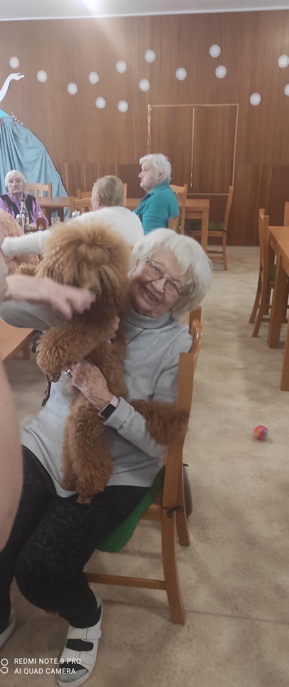 Na konci posezení jsme měli zajímavou návštěvu. Syn pečovatelky Moniky přivedl pudlíka Maxe, který se bude připravovat na canisterapii. A tak se Maxík nechal hladit i chovat v předstihu skoro od nás všech. 👏👏👏