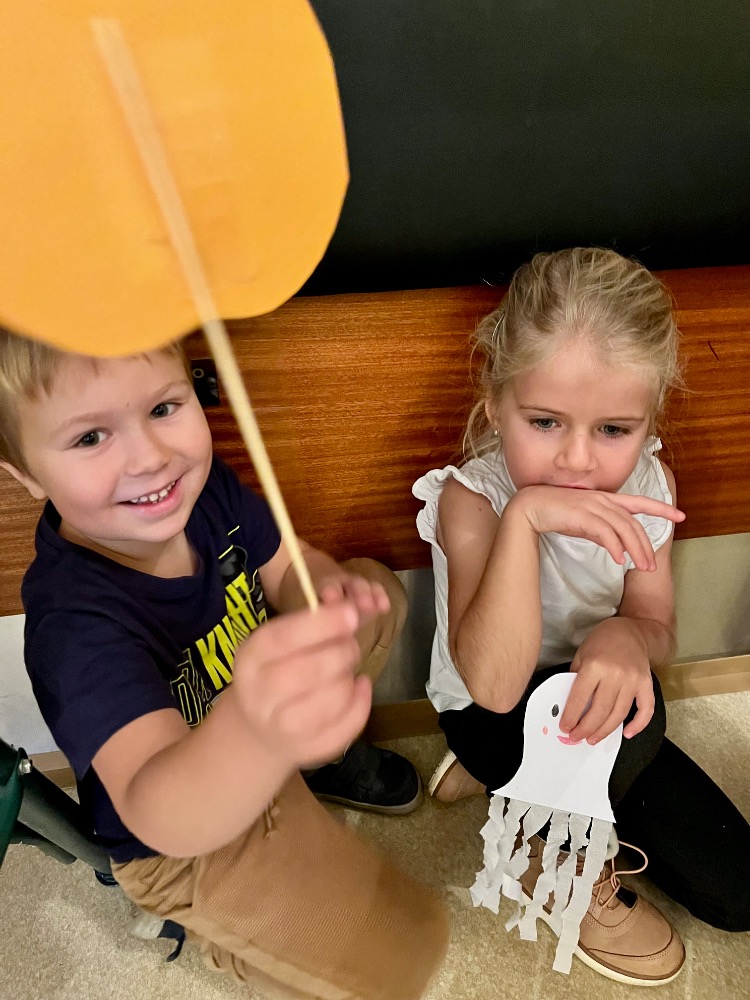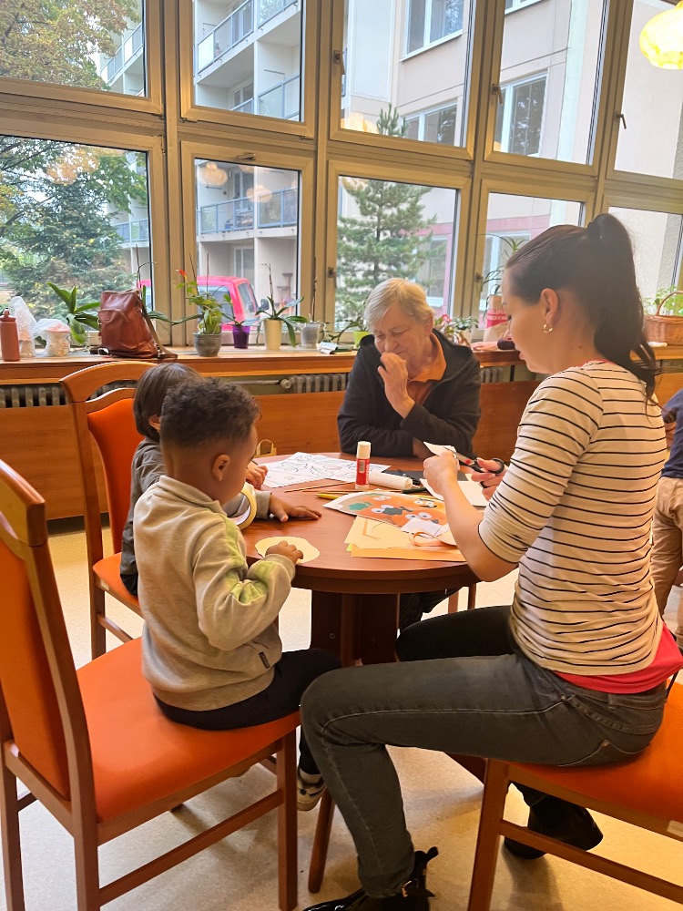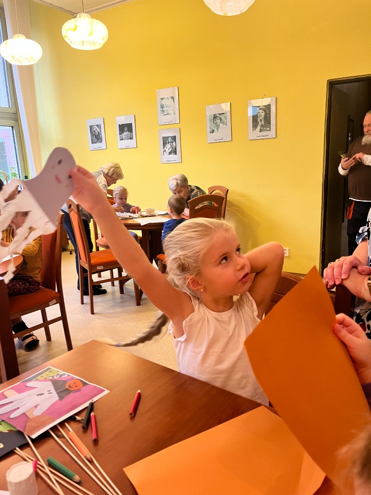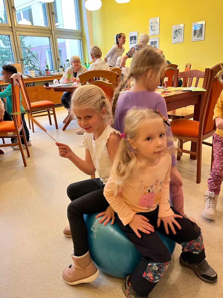 Ve čtvrtek dopoledne se penzionem pro seniory Ke koupališti rozléhal dětský smích a radostná energie. Zavítaly k nám opět malé děti z dětské skupinky U zajíčků, aby se se seniorkami věnovaly společnému podzimnímu tvoření. Některé děti využily své výtvory k tomu, aby nám s nimi bez jakékoliv přípravy zahrály divadlo. Dětská přirozenost a hravost je upřímná a bez přetvářek 🙂💃💃