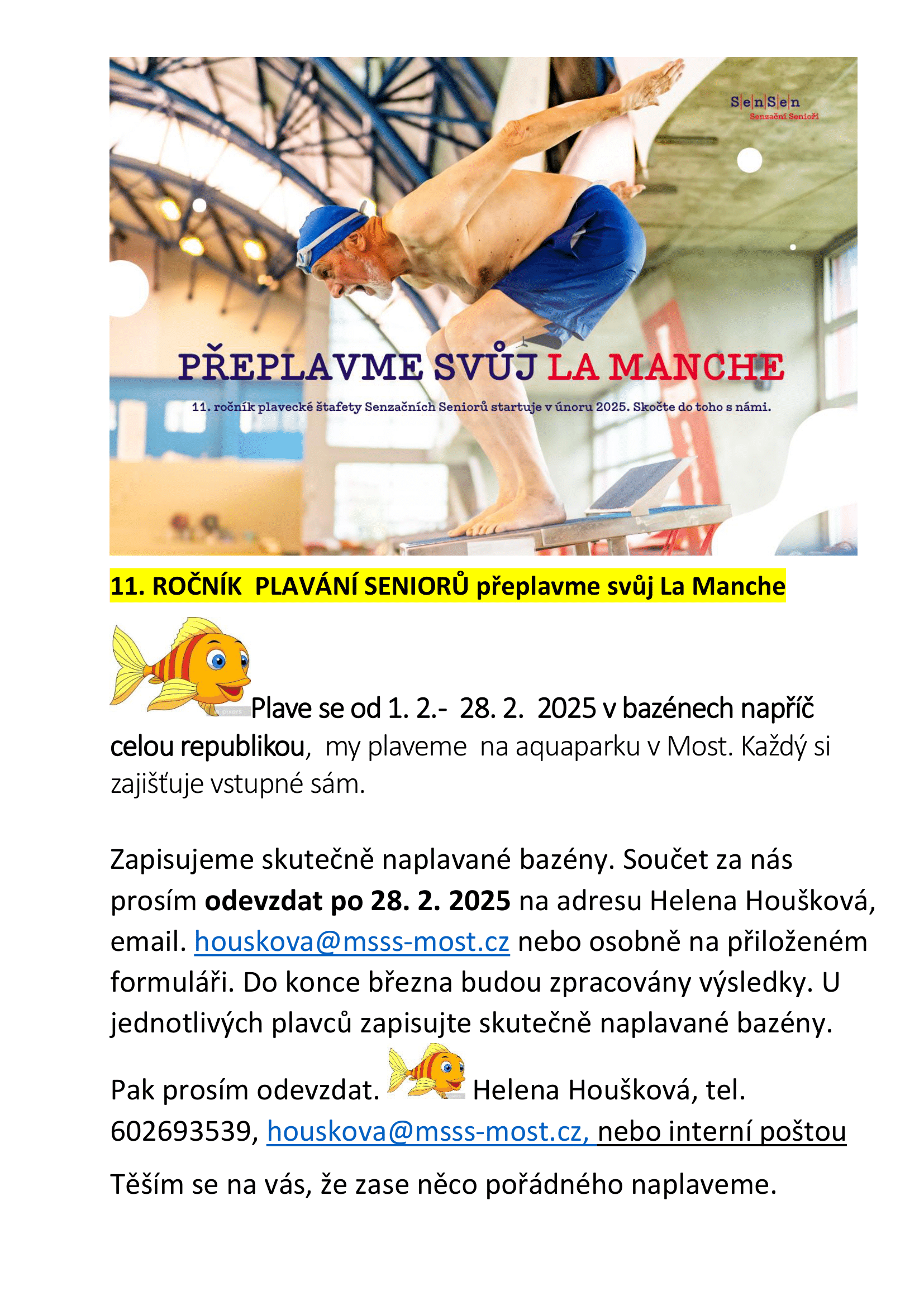 Zveme co nejvíce seniorů k účasti na akci Přeplavme svůj La Manche, která bude probíhat 1. – 28. února 2025. Své naplavané metry je potřeba hlásit p. Houškové buď SMS na telefon 602 693 539 anebo emailem houskova@msss-most.cz. 🙏🙏🙏